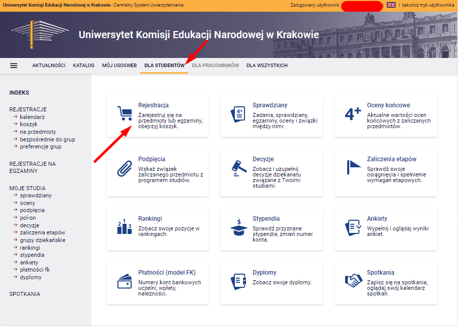 - w zakładce „DLA STUDENTÓW” wybrać kafelek „REJESTRACJA”