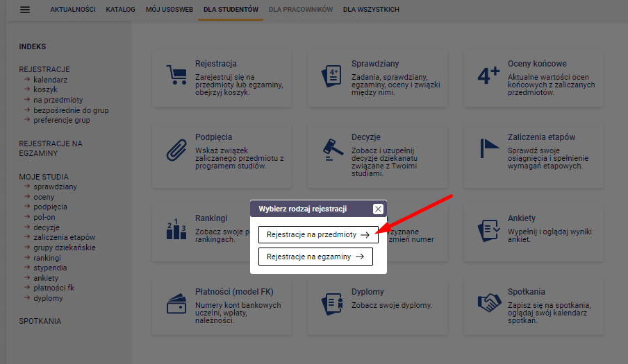 - Wybierz rodzaj „Rejestracje na przedmioty”