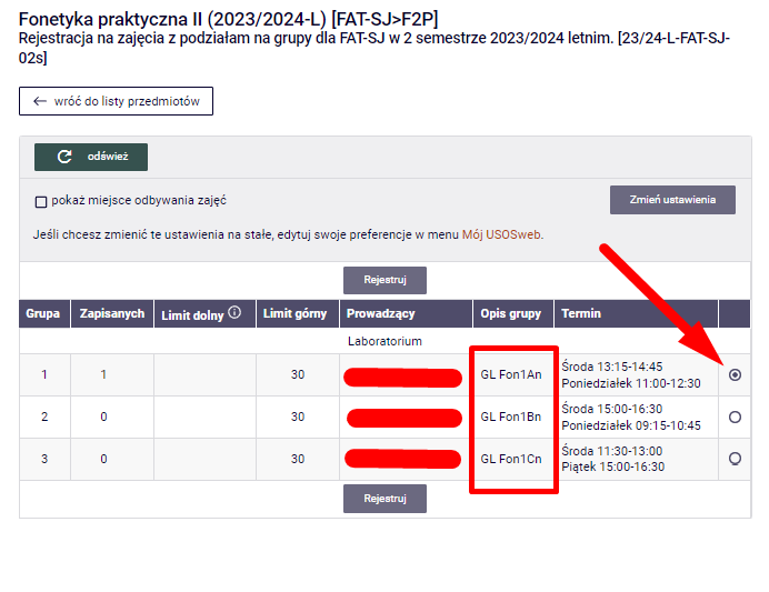 - Należy zarejestrować się do wszystkich wyświetlanych form zajęć danego przedmiotu (wykładowych, konwersatoryjnych, laboratoryjnych, etc.) ze swojego planu, wybierając tylko jedną grupę laboratoryjną i konwersacyjną z pola wyboru dla danego przedmiotu.